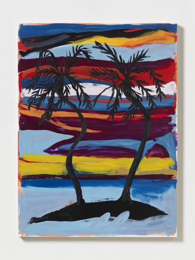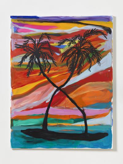Typically working in series, his most iconic works are gestural paintings that boldly feature his name as their subject, in which the letters fluctuate between signifiers and abstracted forms. Lately, the name has given way to more figurative motifs such as leaves, fish, skeletons, insects, ghosts, and sunsets.