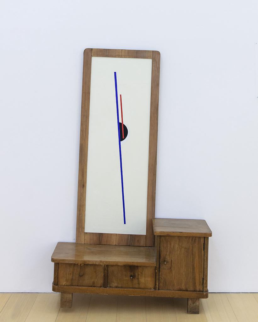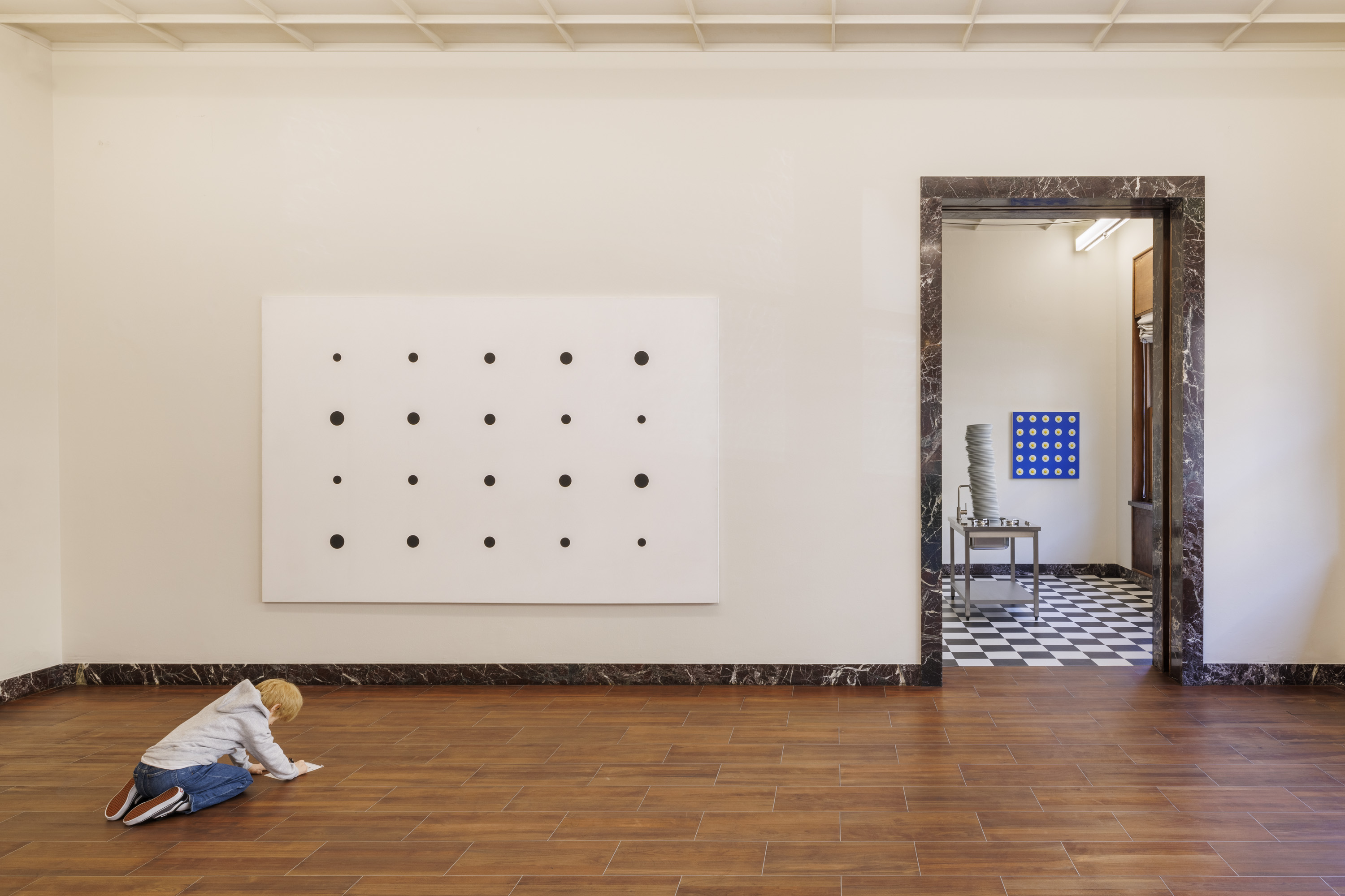The three artists bring their shared affinities to bear in a subtle artistic dialogue. At MASSIMODECARLO, the visitor will come across the uncanny presence of a child figure, kneeling in the middle of the room, drawing one of Armleder's paintings on a sheet of paper. This kind of conversation between the duo and the Swiss artist is present in every space.